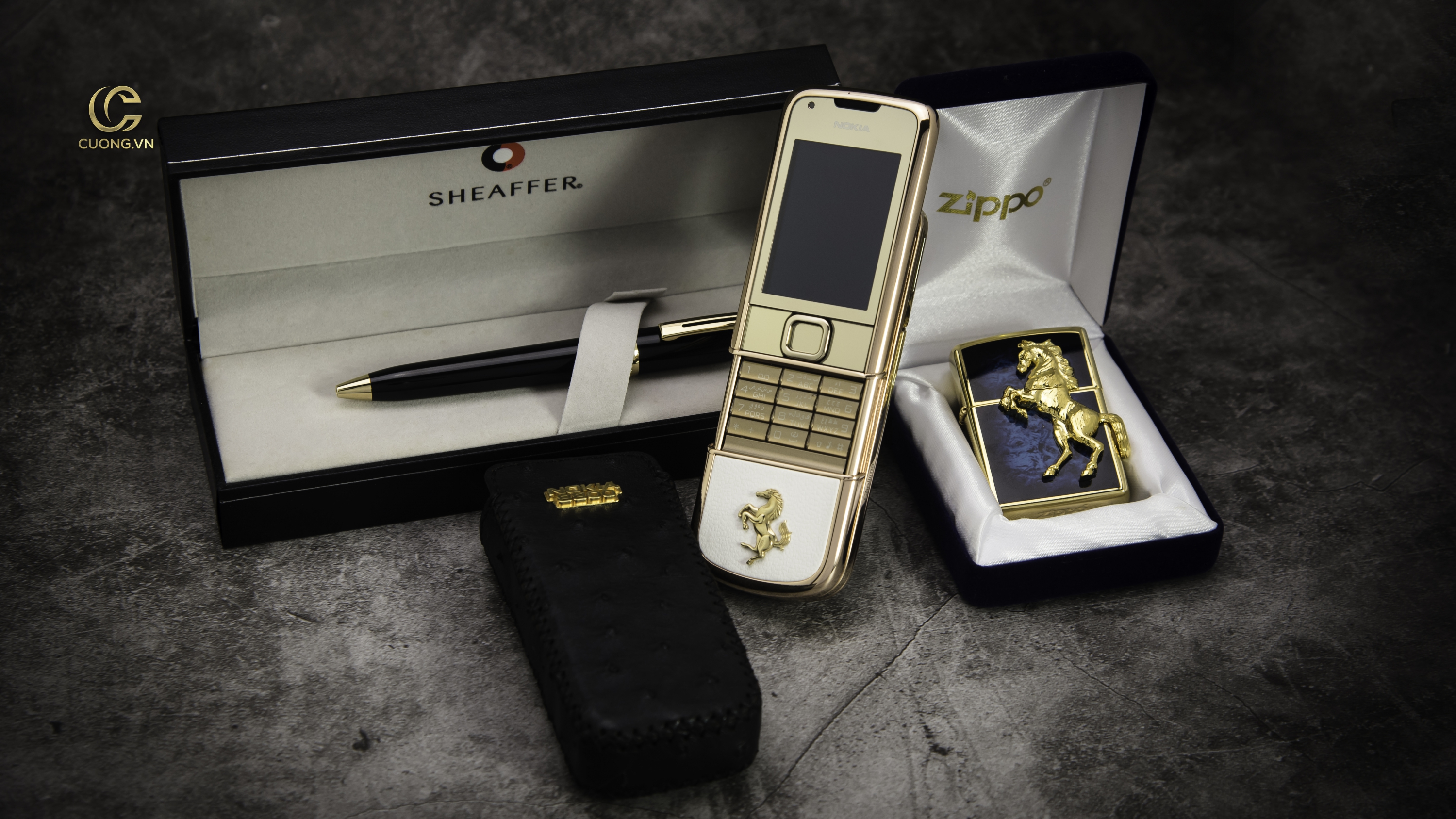 Fullbox bao gồm: Bật lửa hình Ngựa mạ vàng, bút ký mạ vàng Sheaffer, bao da đà điểu đính logo Nokia 8800 mạ vàng.