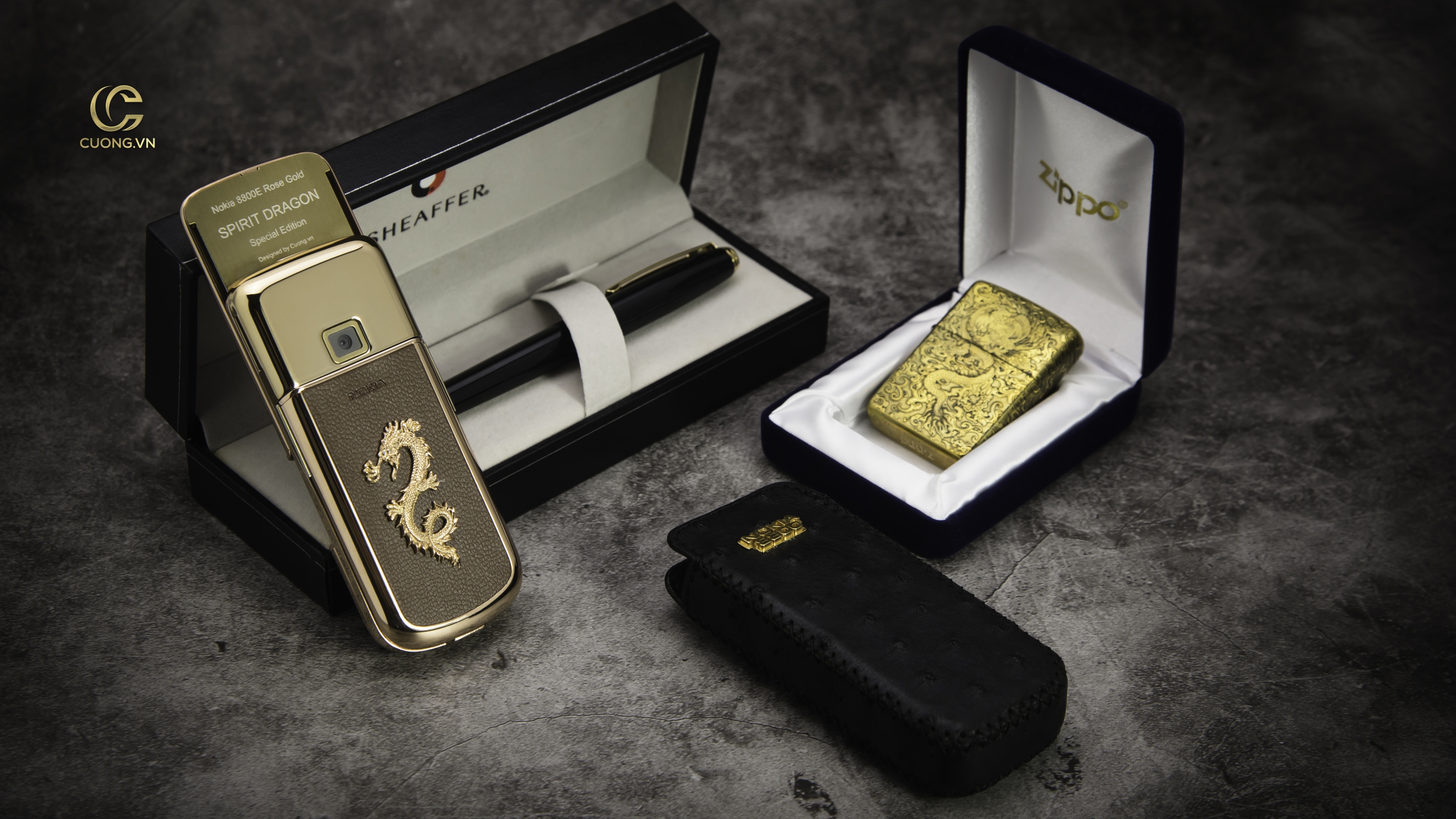 Fullbox bao gồm: Bật lửa mạ vàng hình Rồng, bút ký Sheaffer mạ vàng, bao da đà điểu đính logo Nokia 8800 mạ vàng.