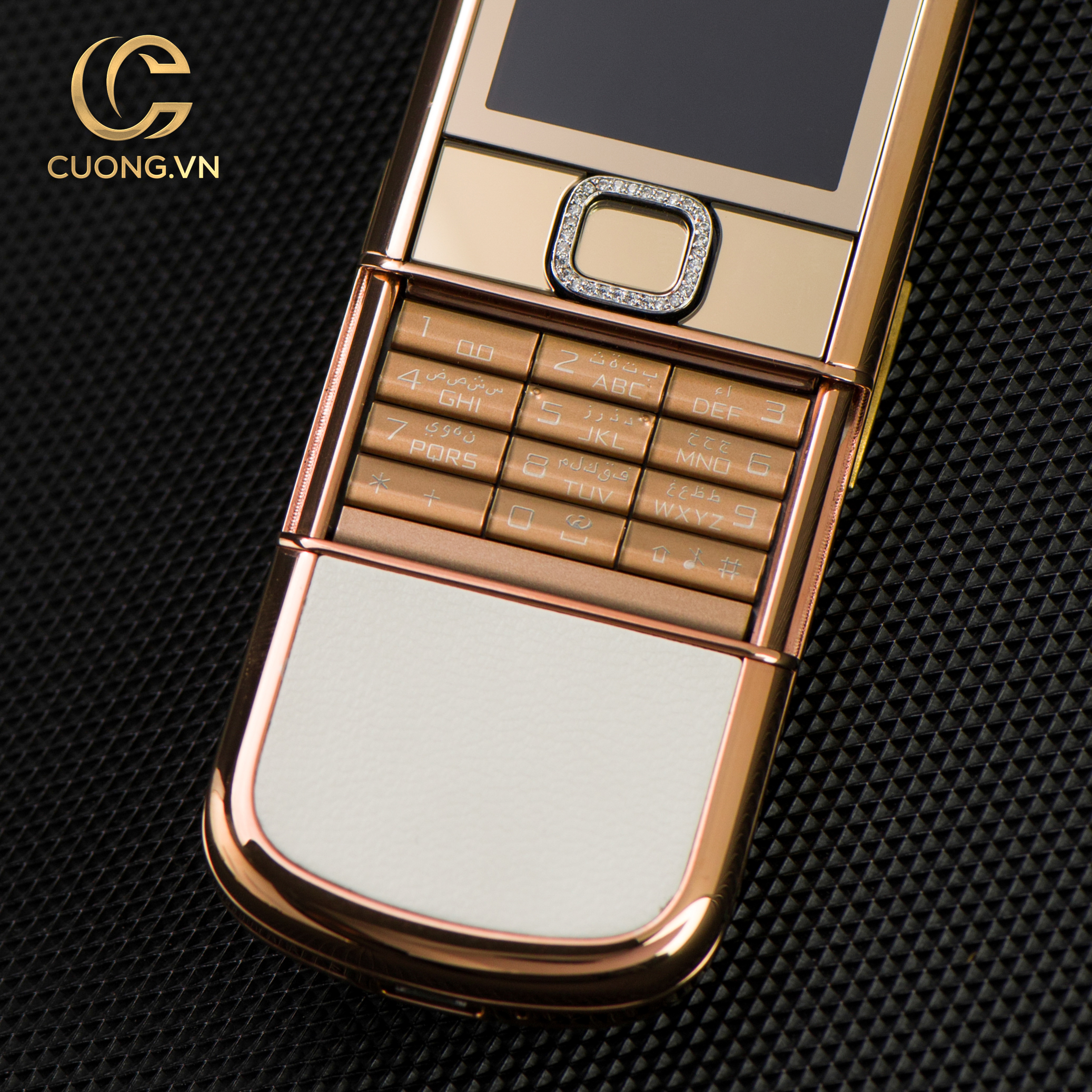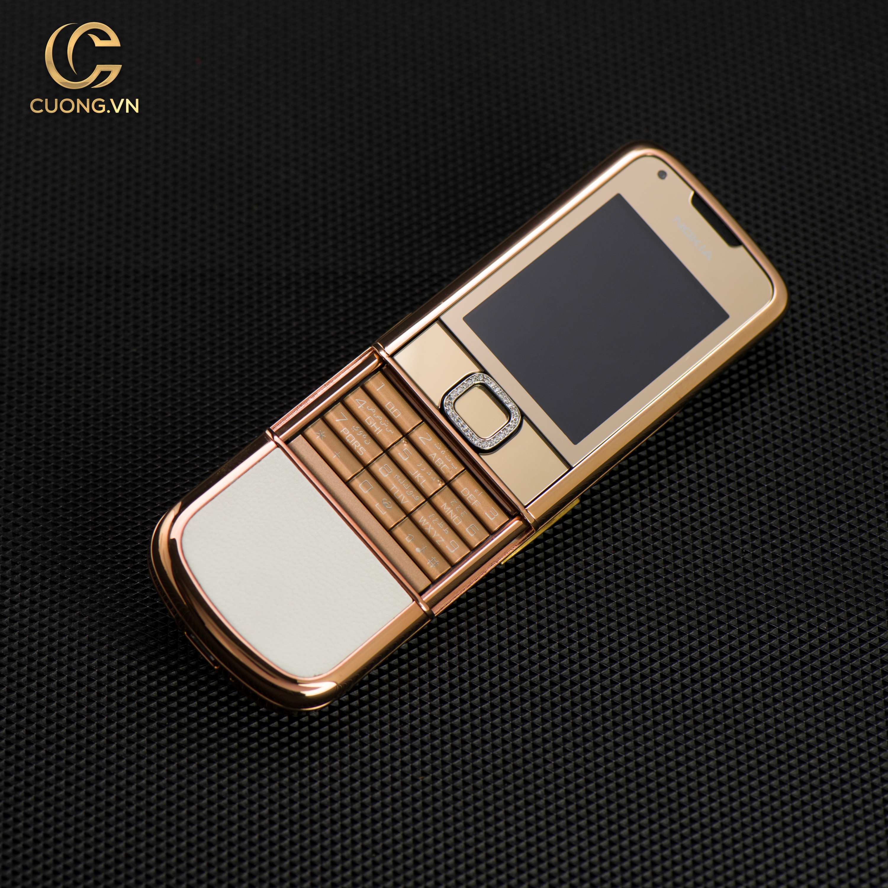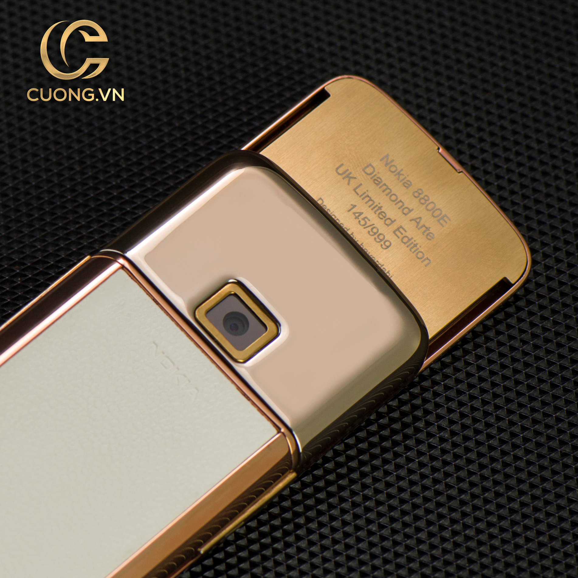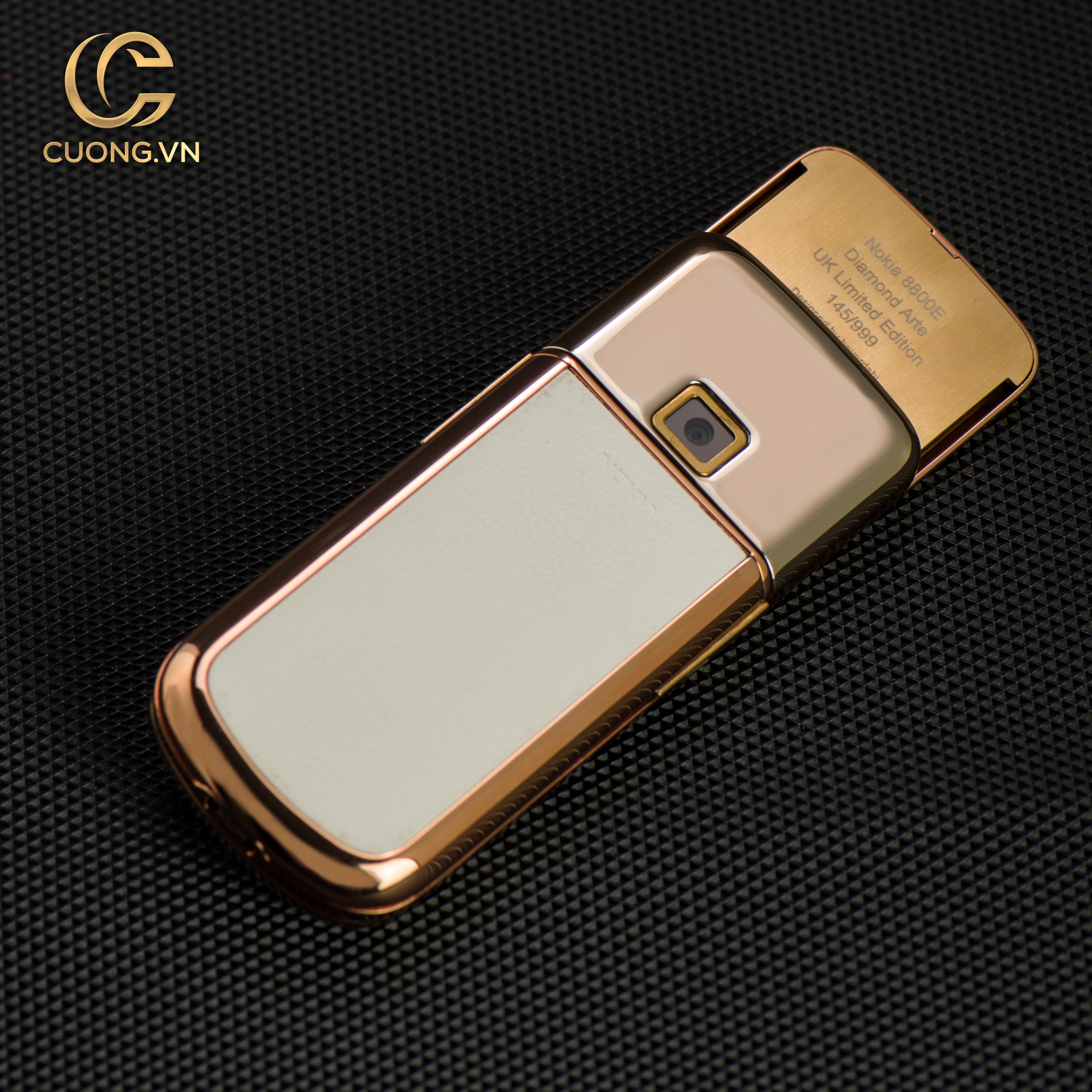 Với thiết kế giản dị nhưng vô cùng sang trọng và đẳng cấp, chiếc điện thoại Nokia 8800E da trắng đính đá dần trở thành sản phẩm được khách hàng tìm kiếm. Chúng đặc biệt phù hợp với những nữ doanh nhân bởi tổng thể sắc trắng và sự lấp lánh của những viên đá Swarovski. Sản phẩm này được đính đá ở phần nút điều chỉnh, các đường viền mặt trước và mặt sau xung quanh cáp trượt, tạo thành một sản phẩm vô cùng hài hòa và thu hút.